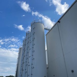 This photograph illustrates the significant dirt and grime accumulated on industrial silos at a large facility, prior to our drone cleaning intervention. The visible discoloration and environmental buildup highlight the challenges faced by industrial sites in maintaining large structures. Our specialized drone cleaning services are designed to tackle such extensive cleaning needs, preparing these surfaces for a transformative wash that restores their original appearance and cleanliness.